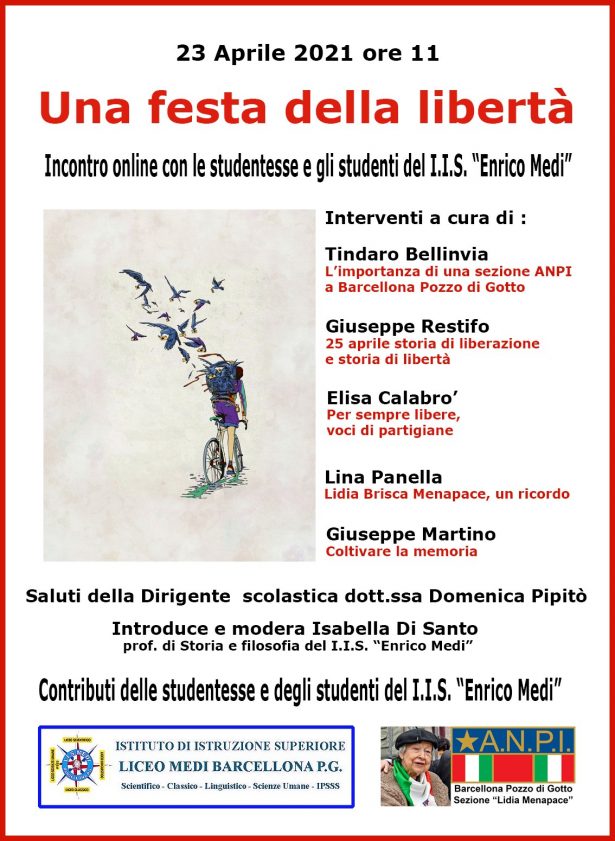 La sezione comunale Anpi “Lidia Menapace” di Barcellona P.G. e l’I.I.S. “Medi” di Barcellona P.G. in occasione della Festa della Liberazione 2021, il 23 aprile p.v. organizzano un incontro online con le studentesse e gli studenti del “Medi” volto a ricordare nella sua profonda attualità il 25 aprile 1945, data in cui l’Italia si liberava dall’oppressore nazi-fascista.