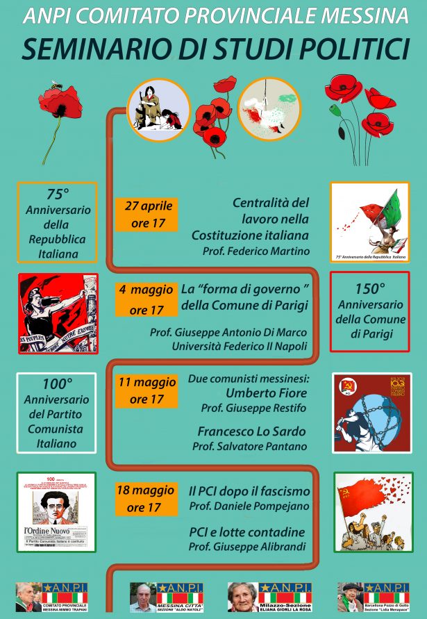 Tra le attività che l’Anpi Provinciale e le Sezioni Comunali hanno dedicato e dedicheranno alla giornata del 25 Aprile ci sono gli incontri con le scuole, con l’I.I.S. “Verona Trento – Majorana”, 5 incontri on line (tenuti dai Proff. Daniele Pompejano, Beniamino Ginatempo, Giuseppe Restifo, Giuseppe Baglio e Felice Scalia) l’incontro con l’I.I.S. “Enrico Medi” di Barcellona P. d. G. (tenuto da Giuseppe Restifo, Tindaro Bellinvia, Giuseppe Martino, Lina Panella, Elisa Calabrò, Isabella Di Santo) e un ciclo di Seminari di Studi Politici che partendo dalla Costituzione (tenuto dal Prof. Federico Martino) spazia tra i comunisti messinesi durante il fascismo: Fiore e Lo Sardo (tenuto dai Proff. Giuseppe Restifo e Salvatore Pantano), la Comune di Parigi (tenuto dal Prof. dell’Università Federico II di Napoli Giuseppe Antonio Di Marco), il Pci dopo il fascismo e Pci e lotte contadine (tenuti rispettivamente dal Prof. Daniele Pompejano e dal Prof. Giuseppe Alibrandi).