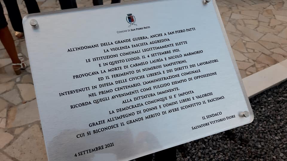 Il 4 settembre del 1921, a San Piero Patti, in provincia di Messina, uccisi dai fascisti, morivano Carmelo Lauria e Nicolò Marmorio. Il 4 settembre del 2021, a cent’anni esatti di distanza, San Piero Patti ho voluto ricordarli. E per ricordarli meglio, con un segno permanente nel tempo, ha inaugurato un monumento alla loro memoria e alla memoria di tutti i sampietrini “intervenuti in difesa delle civiche libertà e dei diritti dei lavoratori”.