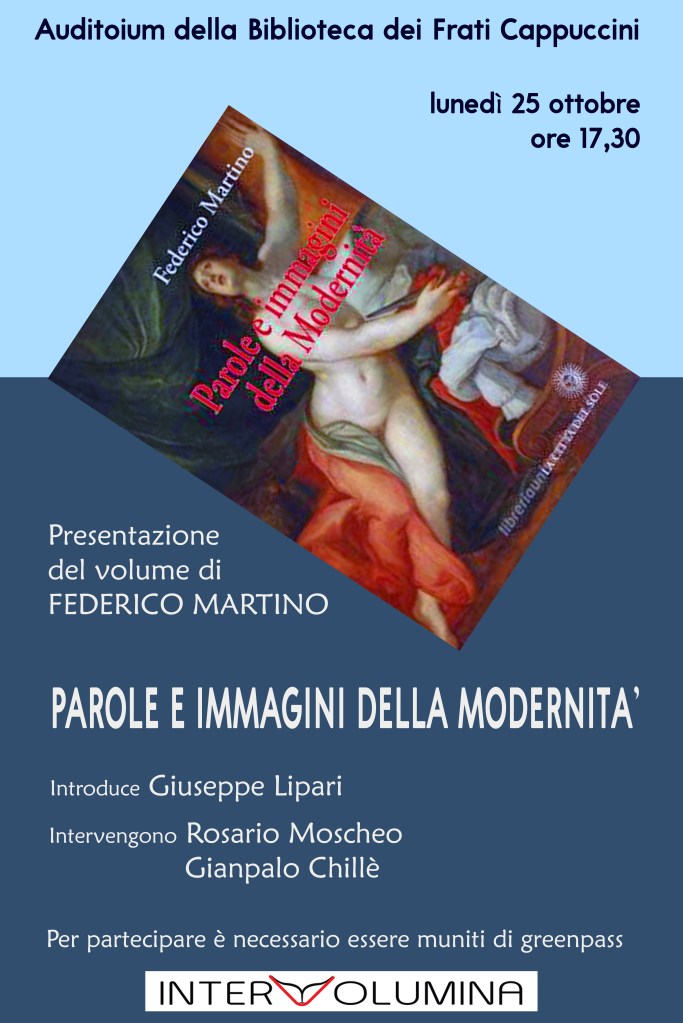 Si presenta lunedì 25 ottobre 2021 presso l’auditorium della Biblioteca dei Frati Cappuccini a Messina “Parole e Immagini della Modernità” di Federico Martino, introduce Giuseppe Lipari, intervengono Rosario Moscheo e Gianpaolo Chillè. L’ingresso è libero e gratuito previa presentazione del green pass.