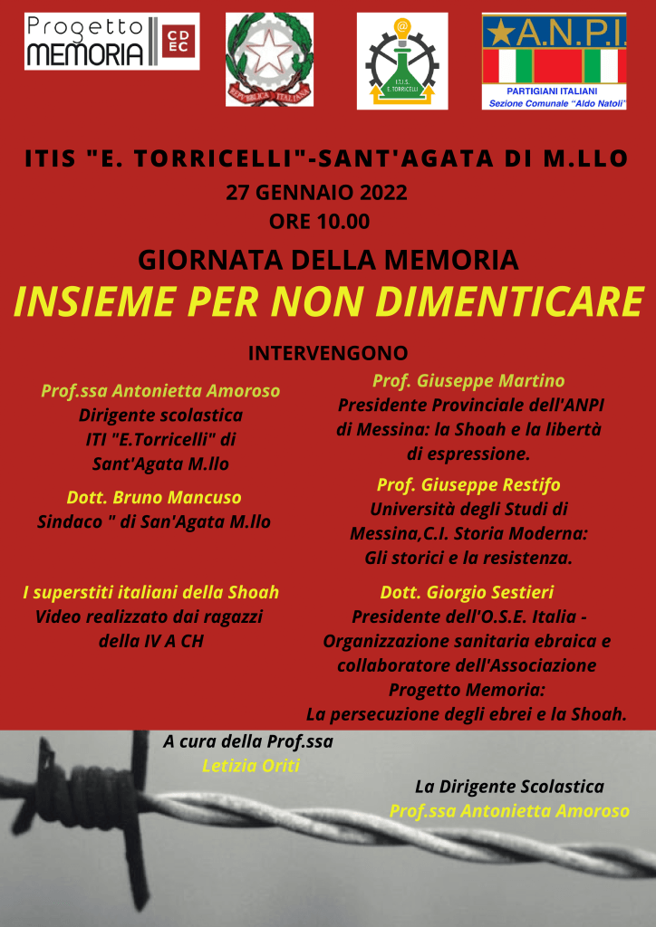 Insieme per non dimenticare. L’ITIS “E. Torricelli” di S. Agata Militello organizza, giovedì 27 gennaio 2022, alle ore 10:00, nell’ambito delle attività di promozione della cittadinanza attiva e della cultura della legalità e della solidarietà, un seminario dal titolo “Insieme per non dimenticare”. Sarà un’occasione per riflettere sul genocidio degli ebrei e sui terribili eventi storici che hanno funestato la nostra Nazione e tutta l’Europa e per mantenere sempre viva nelle nuove generazioni la memoria di ciò che è stato.