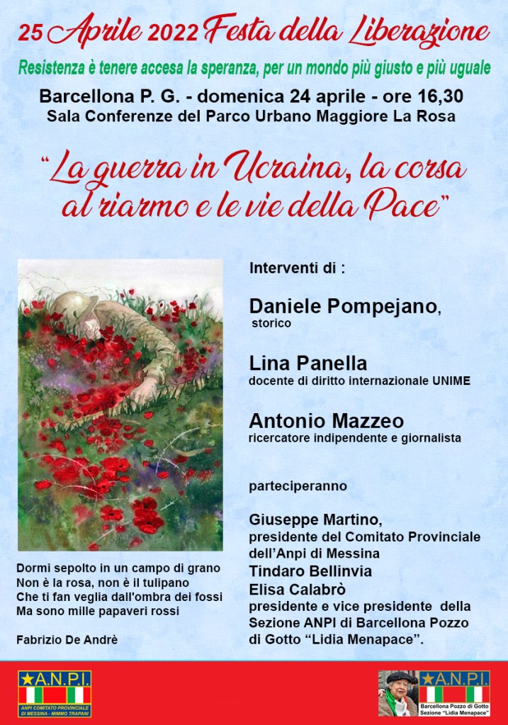 La sezione ANPI di Barcellona P.G. “Lidia Menapace”, in vista della Festa della Liberazione 25 aprile, organizza un incontro/dibattito domenica 24 alle ore 16,30 presso la Sala Conferenze del “Parco Urbano Maggiore La Rosa”