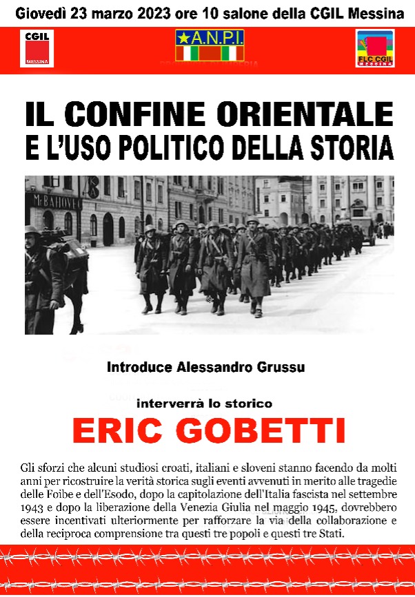 La stessa Anpi di Messina, la Cgil Messina e la Flc-Cgil Messina organizzano poi, giovedì 23 marzo 2023, alle ore 10, presso il Salone della Cgil di via Peculio Frumentario n. 6, l’incontro pubblico dal titolo “Il confine orientale e l’uso politico della storia” con lo storico Eric Gobetti. Introduce Alessandro Grussu.