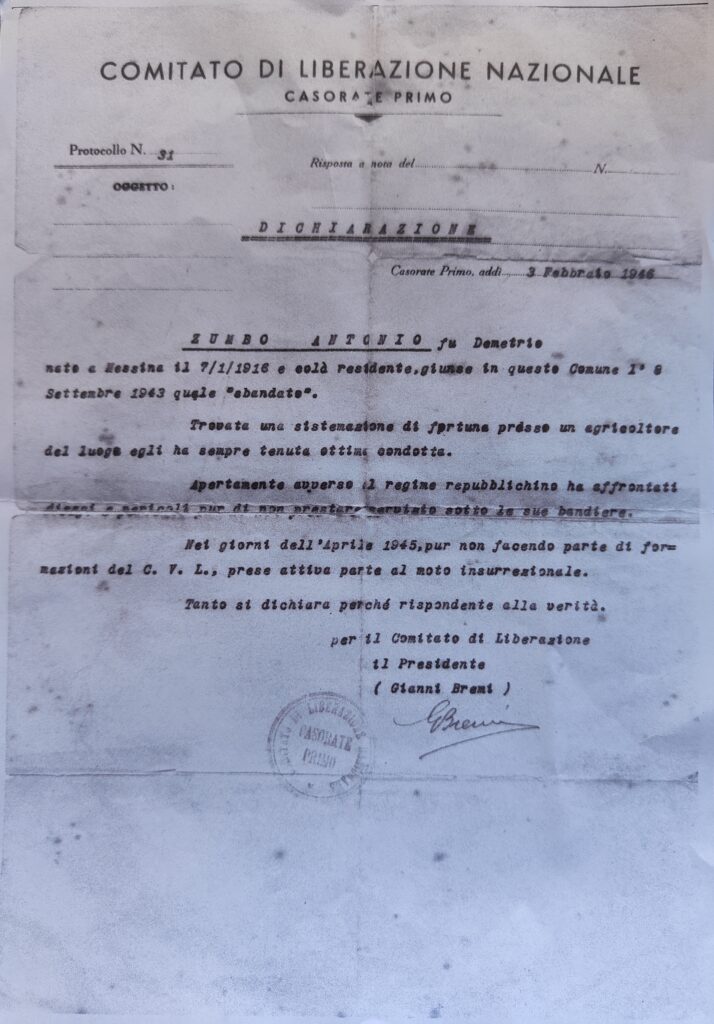 Così viene affermato anche nel documento del Comitato di Liberazione Nazionale di Casorate Primo – a firma del Presidente Gianni Bremi, ove viene dichiarato che ZUMBO Antonio fu Demetrio … l’8 Settembre del 1943 giunse nel comune di Casorate Primo (PV) “quale sbandato” e trova una sistemazione di fortuna presso un agricoltore del luogo. Apertamente avverso al regime repubblichino ha affrontato disagi e pericoli pur di non prestare servizio sotto le sue bandiere. Nei giorni dell’aprile 1945, pur non facendo parte di formazioni del C.V.L., prese parte attiva al moto insurrezionale”.