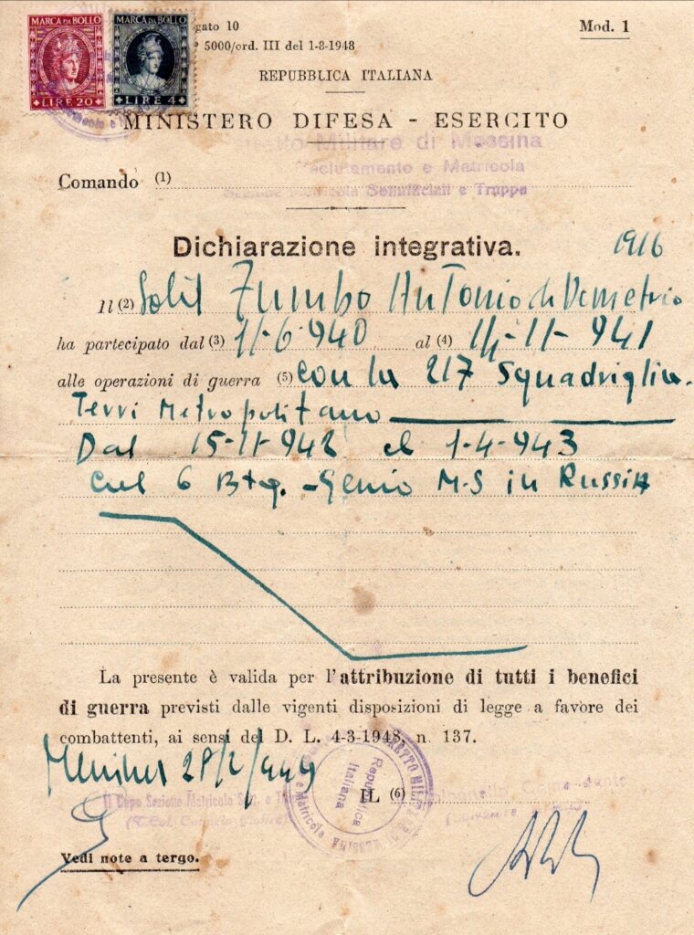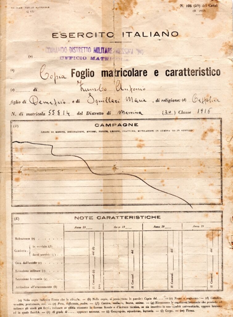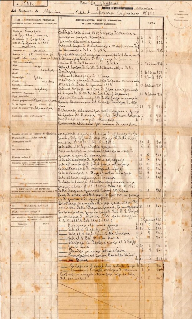 Il Foglio Matricolare e altri documenti erano accuratamente conservati e sono stati rinvenuti di recente in un vecchio cassetto della Casa Paterna/Materna; “…scorrere quelle righe del suo stato di servizio militare compresa la Seconda Guerra, ovviamente è dir poco , … ci ha fatto piangere … e tanto…”.