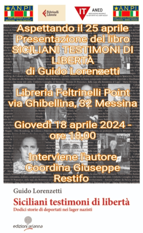 In vista del 25 aprile, Festa della Liberazione, la Sezione comunale ANPI “Aldo Natoli” di Messina, la Sezione Provinciale ANPI “Mimmo Trapani” di Messina, l’Aned, sezione di Milano e la Libreria Feltrinelli Point di Messina organizzano per il giovedì 18 aprile 2024, alle ore 18,00, presso la Libreria Feltrinelli Point di Messina, sita in via Ghibellina, 32, un incontro di presentazione del libro “Siciliani testimoni di libertà – 12 storie di deportati nei lager nazisti” di Guido Lorenzetti, vice-presidente della sezione Aned di Milano.