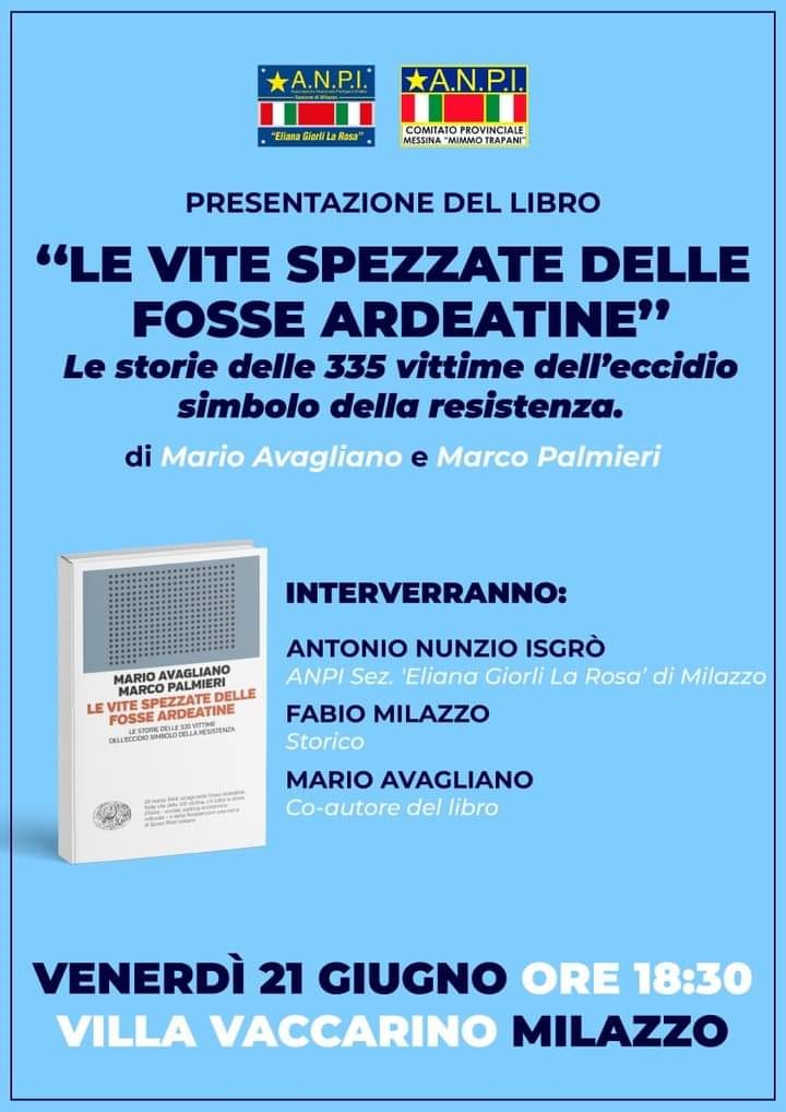 Ne parla il libro “Le vite spezzate delle Fosse Ardeatine” (Einaudi) di Mario Avagliano e Marco Palmieri che, dopo aver girato l’Italia e aver raggiunto in poche settimane la seconda edizione, ora sbarca in Sicilia, dove il tour della memoria del coautore Mario Avagliano toccherà Palermo (19 giugno, ore 18, Mondadori Flaccovio Bookstore), Trapani (20 giugno, ore 18, Museo San Rocco), Milazzo (21 giugno, ore 18.30, Villa Vaccarino), Messina (22 giugno, ore 18.30, Feltrinelli Point) e Casteltermini (29 giugno), accompagnato in tutte le tappe dall’Anpi.