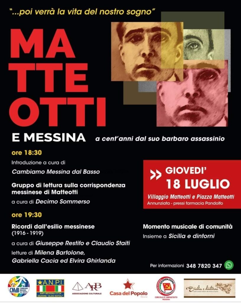 Ricordando Giacomo Matteotti e il suo confino messinese, CMdB insieme ad ANPI, ARB, Casa del Popolo, Rifondazione Comunista, Sicilia e Dintorni, organizza un momento di conoscenza e incontro nei luoghi che portano il suo nome.