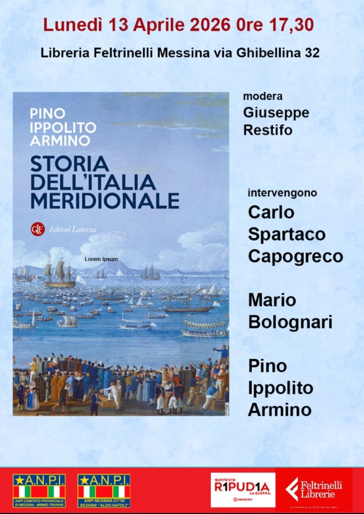 Lunedì 13 aprile 2026, alle 17.30, presso la libreria Feltrinelli di Messina (via Ghibellina 32) si presenta il libro di Pino Ippolito Armino “Storia dell’Italia meridionale”. L’iniziativa è stata presa dall’Anpi messinese insieme a Emergency. L’incontro sarà moderato da Giuseppe Restifo; interverranno, oltre all’autore, Carlo Spartaco Capogreco e Mario Bolognari.Il volume, edito da Laterza, affronta sette momenti decisivi per capire le radici storiche del divario Nord-Sud: dal Regno borbonico all’Italia contemporanea.