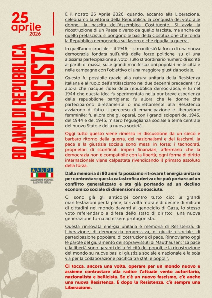 14 aprile 2026 Senza categoria 25 aprile 2026: 80 anni di Repubblica antifascista Posted by stinocannata Oplus_16908288 Condividi: Condividi su X (Si apre in una nuova finestra) X Condividi su Facebook (Si apre in una nuova finestra) Facebook Condividi su WhatsApp (Si apre in una nuova finestra) WhatsApp Mi piace Caricamento... Correlati