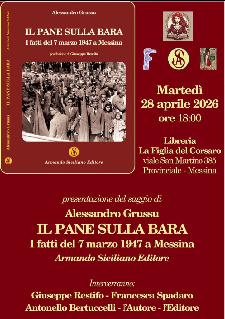 21 aprile 2026 Senza categoria LIBRERIA LA FIGLIA DEL CORSARO, PROVINCIALE – MESSINA: PRESENTAZIONE DEL LIBRO “IL PANE SULLA BARA” Posted by stinocannata Oplus_16908288 Condividi: Condividi su X (Si apre in una nuova finestra) X Condividi su Facebook (Si apre in una nuova finestra) Facebook Condividi su WhatsApp (Si apre in una nuova finestra) WhatsApp Mi piace Caricamento... Correlati